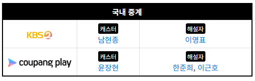 - 중계: KBS2 + 쿠팡플레이 생중계 예정