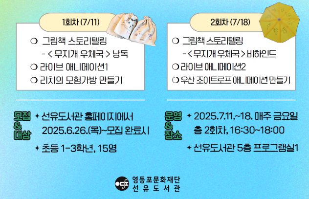 안녕하세요! 오늘은 여름방학을 맞아 선유도서관에서 열리는 특별한 독서 프로그램을 소개해드릴게요. 초등학교 1~3학년 친구들을 위한 정유진 작가와의 만남, 「무지개 우체국」 프로그램인데요! 책 속 세상을 직접 체험할 수 있는 멋진 기회랍니다 😊