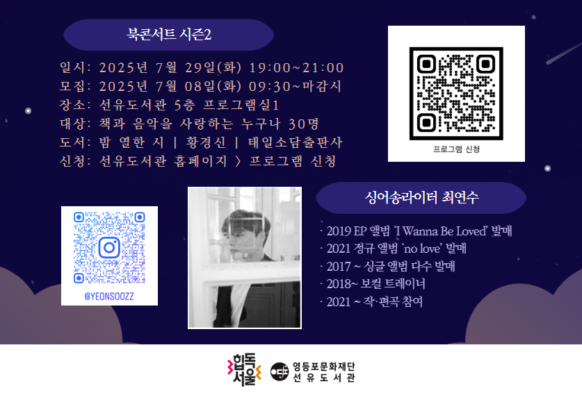 지금이 바로 새로운 감동을 만날 기회입니다. 선유도서관에서 펼쳐질 이 특별한 북콘서트에 참여해 보세요. 단 한 번의 경험으로 책과 음악이 전하는 위로를 온전히 느끼실 수 있습니다. 늦기 전에 신청 버튼을 눌러주세요!